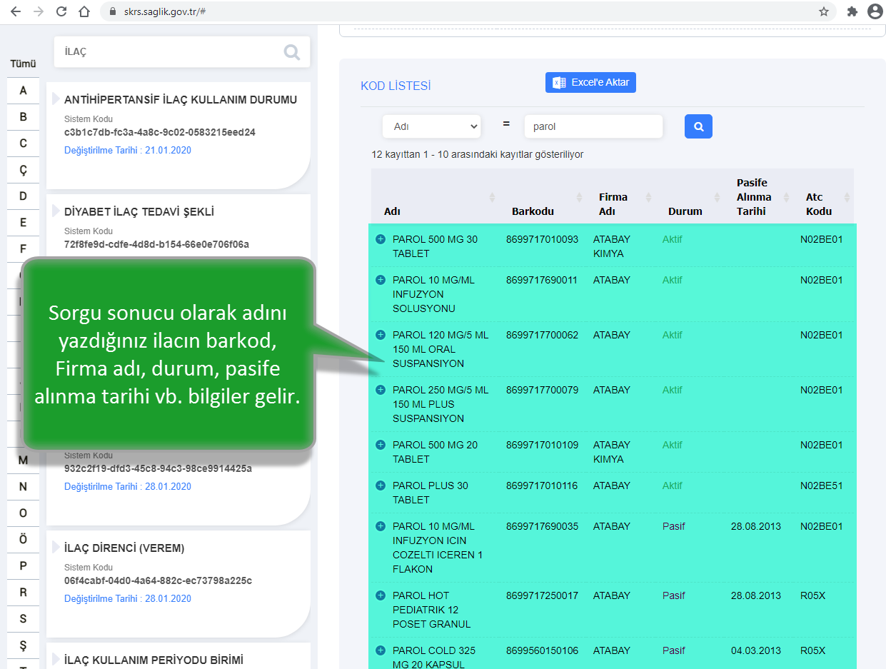 İlaçların barkod, firma adı, durum (aktif, pasif), pasife alınma tarihi, ATC kodu ve adı gibi bilgileri